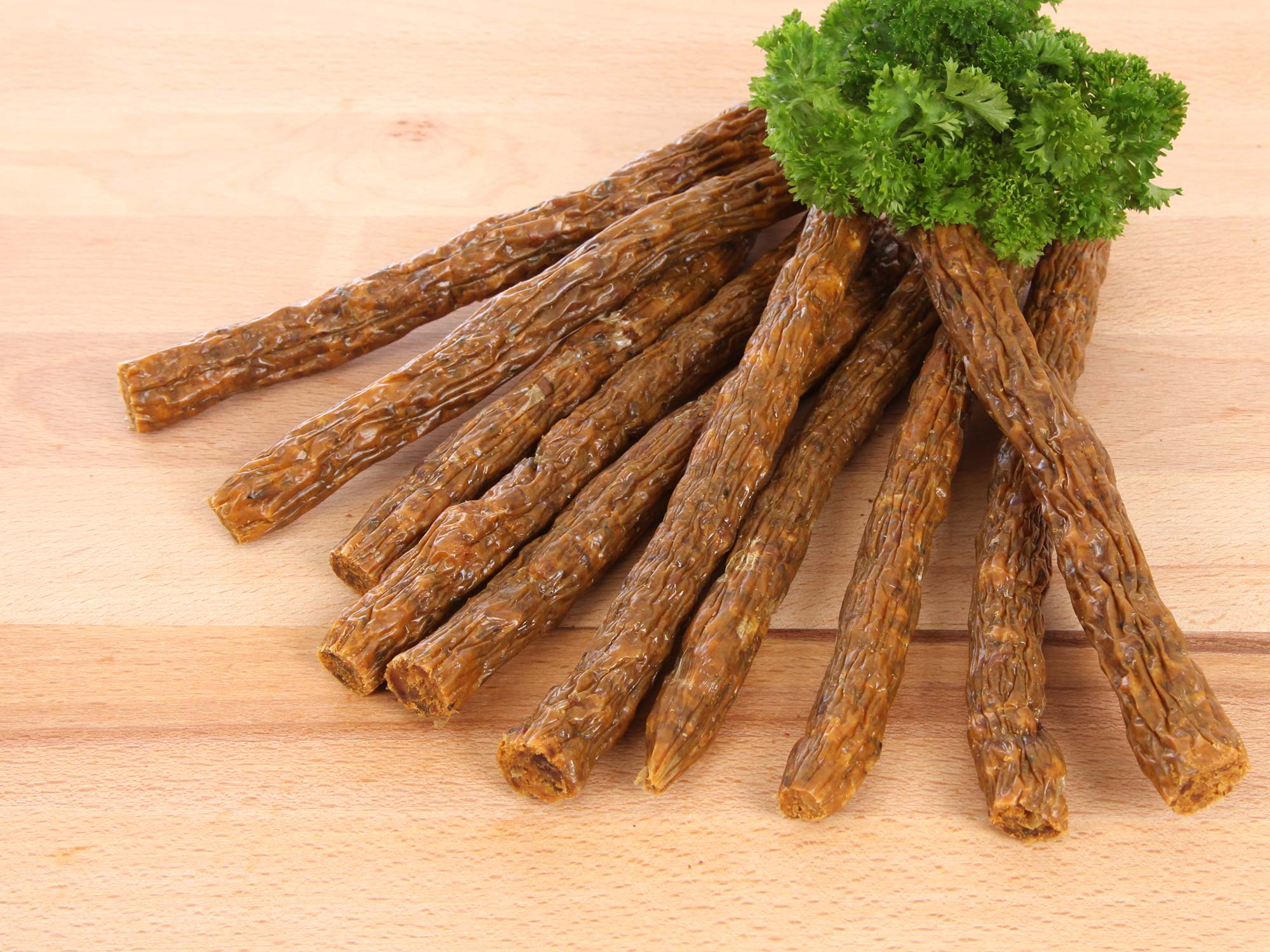 Die Knusperstangen sind frei von Getreide und künstlichen Zusätzen und kommen im Kollagen-Darm. Die Stangen sind etwa 18 - 19 cm lang und lassen sich gut portionieren.