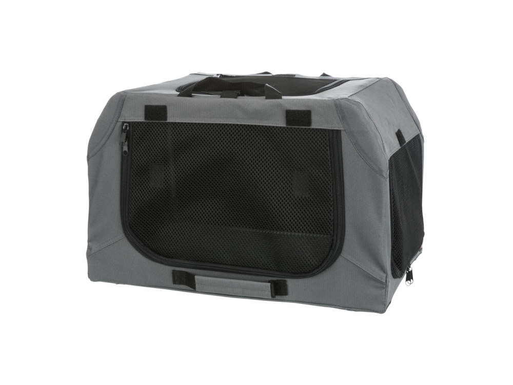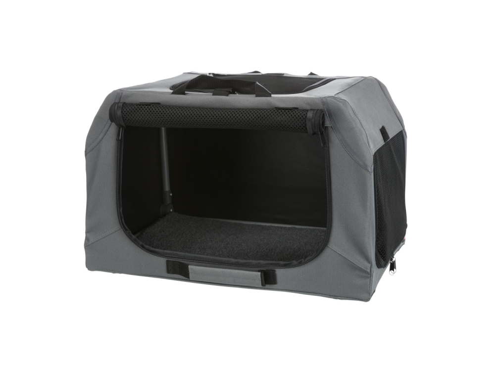 Der Soft Kennel von Trixie ist der ideale Begleiter auf Reisen, beim Training oder zur Ausstellung. Dank eines stabilen Metallrahmens ist dieser Kennel extrem robust und standfest, gleichzeitig aber leicht genug und einfach zusammenklappbar, um ihn schnell zu transportieren, 3 Tragegriffe bieten die Möglichkeit, den Soft Kennel entweder zusammengeklappt oder aufgebaut zu tragen. Mit wenigen Handgriffen ist der Soft Kennel aufgebaut. Er ist an 3 Seiten zu öffnen, eine Liegematte in Lammfell-Optik (abnehmbarer Bezug) ist im Lieferumfang enthalten.