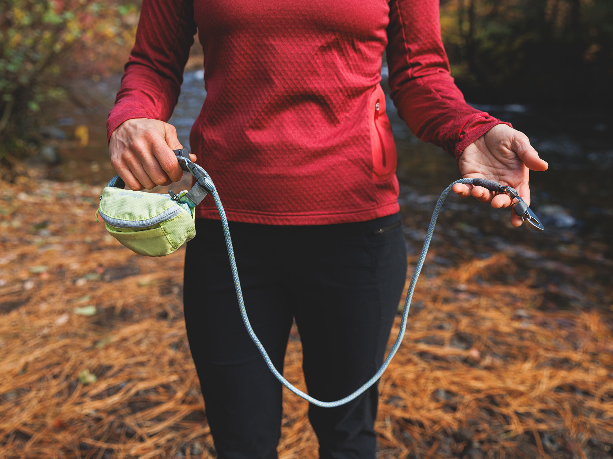 - Material: Tasche 150 Denier Polyester mit wasserabweisender BEschichtung (bluesign® zertifiziert), Leine 7 mm reflektierendes Kernmantel-Seil, Gürtel 20 mm Polyester-Gurtband, Karabiner Eloxierter 6061-T6 Aluminium-Crux Clip™ und HitchLock™ Seilversteller, Schnalle ITW Nexus Waveloc Steckschnallen, YKK # 3 Reverse Coil Reißverschluss